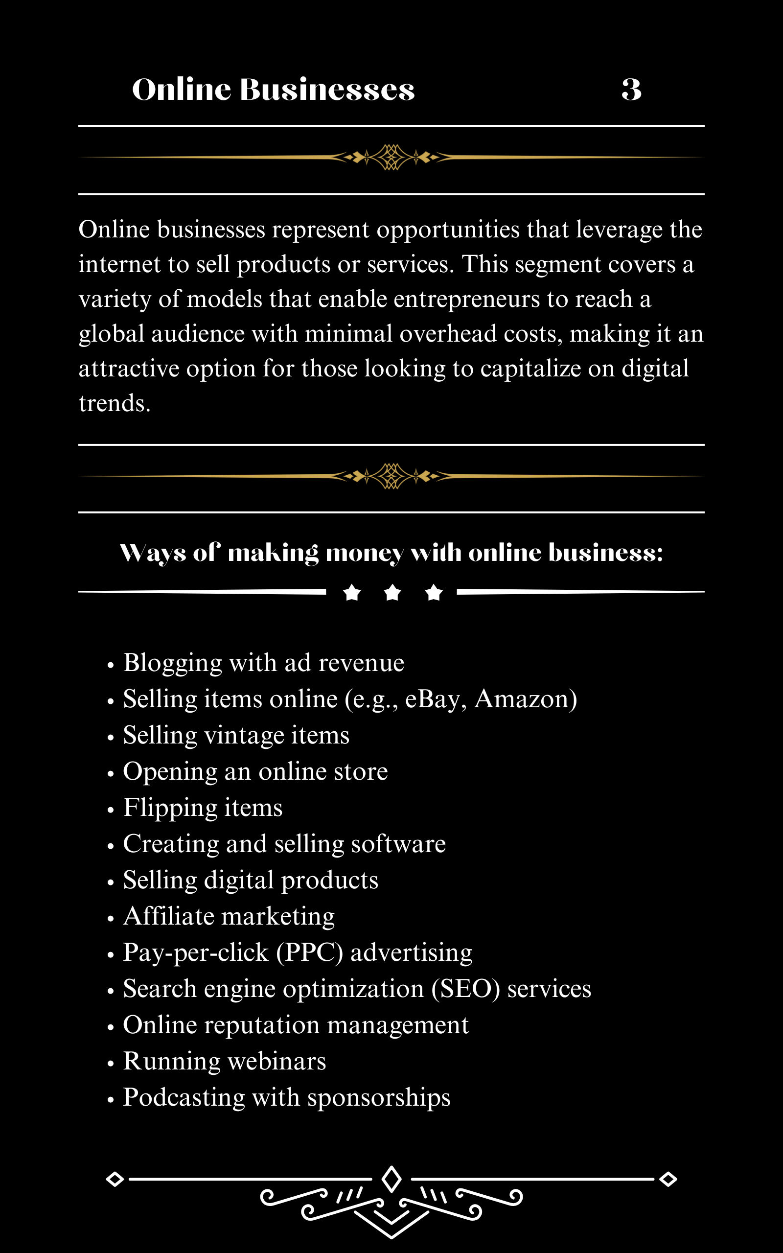 This ebook provides a thorough exploration of various money-making opportunities, offering clear definitions and insights for each sector. Whether you're looking to supplement your income or explore new earning avenues, this guide covers a wide range of options.